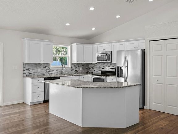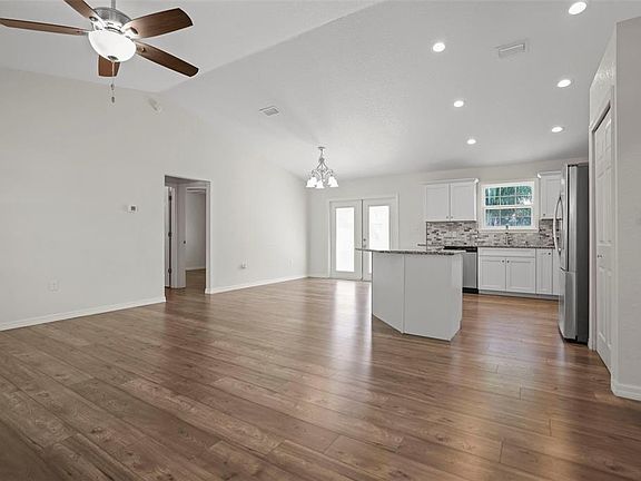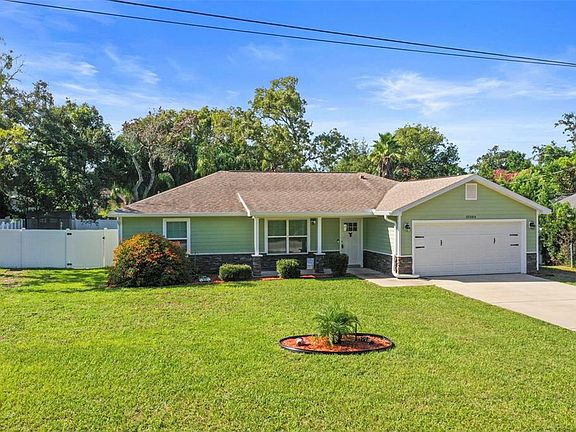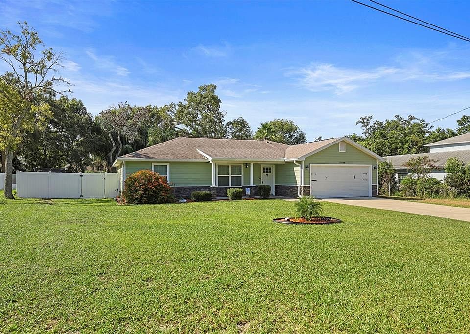 Come view this beautiful, newer, custom 3 bedroom 2 bath home with an inviting front porch and attractive stone accents. This home is well kept and clean. Open floor plan with split bedrooms. Kitchen includes granite counters, stainless steel appliances, custom backsplash and plenty of storage space. Home has no carpet, lots of natural light and French Doors leading out back. Granite counter top in primary bathroom as well. Located on an oversized quarter acre lot with fenced back yard and storage shed included. Great backyard for pets or play. Plenty of room for a pool. No HOA. No CDD. No Flood Zone. No Flood Insurance Required. Come see your new home.