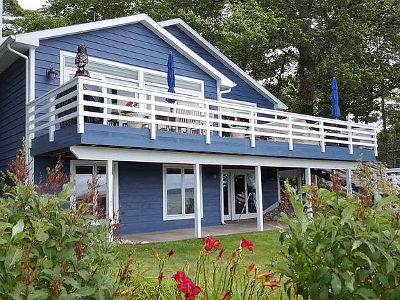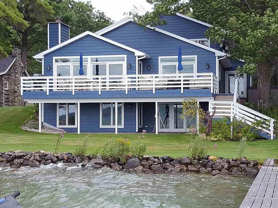 Torch Lake Sandy Bottom Sunset Living in Downtown Alden with your own tennis court and swim spa! This Craftsman style waterfront home has been meticulously maintained inside and out. The home features a wonderful custom kitchen with granite counters, oak cabinetry & Pewabic tile back splashes, Wolf convection wall ovens, Electrolux refrigerator & freezer and Bosch dishwasher. Enjoy meals from a wonderful lakeside formal dining area, living room with electric blinds, gas fireplace outlined with Pewabic tiles, vaulted ceilings and built in granite dry bar and 1/2 bath. Large main floor master bedroom with its own custom private master bath. Two large additional bedrooms and a full bath on the 2nd floor. The lower level is perfect for lakefront indoor entertaining with access to the concrete lakefront patio, 4th bedroom or office/exercise room, waterfront bar. 900 sq ft lakeside deck, Generac house generator, Rainwise weather station, central A/C, dock and large finished, insulated and heated 3 car garage all this with a path through your property to your very own regulation size-fenced in tennis court.