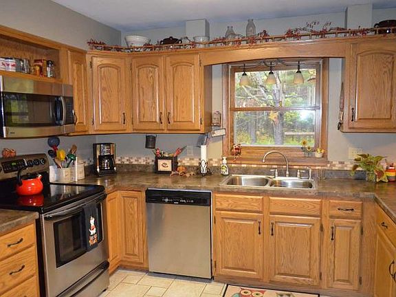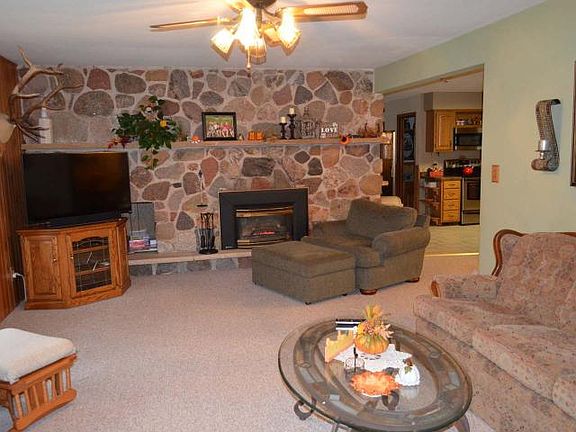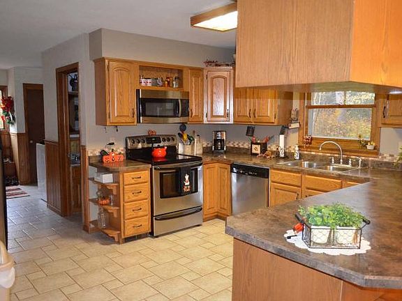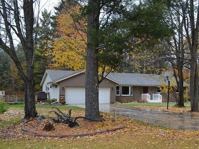 This gorgeous 4 BR, 2 full BA ranch-style home offers perfect country living with over 3 beautifully wooded acres, an attached 2 car garage, a 36x72 insulated pole building that is set up for a construction/logging/trucking business, an adorable 16x22 barn with an office room and back area ideal for a hobby farm, an outdoor dog kennel, a nice front sun deck, exquisite stamped concrete entrance with beautiful landscaping, and a nice backyard patio with a spacious yard and garden area. The home features a first floor laundry, a gorgeous field stone gas-burning fireplace with a built-in grilling system, a large kitchen and dining room, 4 main floor bedrooms, and 2 full baths. The basement has a nice rec room with a hot tub hookup, a root cellar, and several storage rooms. Property is surrounded by wooded land offering privacy in a nice country setting. Call today for a showing!