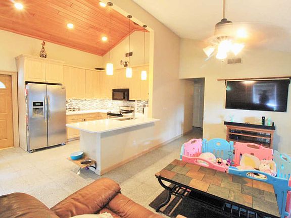 MUST SEE! 3 bedroom 2 full bath Florida home with updated kitchen newly installed countertops and backsplash with pendant lighting and vaulted ceiling. This home is airy and bright and flows effortlessly to the living room and into the screened patio which includes a custom bar for entertaining! Just beyond is the spacious backyard with numerous fruit trees. The backyard also includes large paver path around the home, firepit, horseshoe playing area and room for boat storage. This home has endless potential, call today for your private showing!