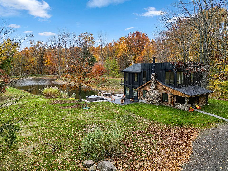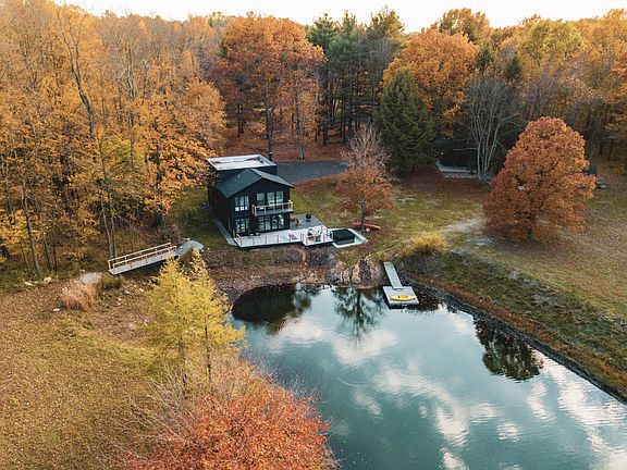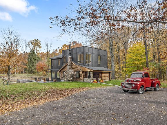 Tucked away on 20 secluded acres is a one-of-a-kind wellness retreat where you can escape, relax, refresh and connect with nature. Once owned by Chicago artist Irene Siegel, this stunning property has been reimagined into a luxurious contemporary 2bed /1den 2.5ba home, with a cozy 3bed 1bath guest cottage. Enjoy yoga on the spacious deck overlooking the private pond or take a paddleboard onto the water. Afterward, relax in the infrared sauna before a cold plunge into the water! The main house pays homage to the original log cabin, while bringing modern design to life with hardwood floors, custom kitchen and baths, a water filtration system, cedar decking, a blue stone entry and so much more. The guest cottage features two decorative rosettes painted by Ms. Seigel on its facade.