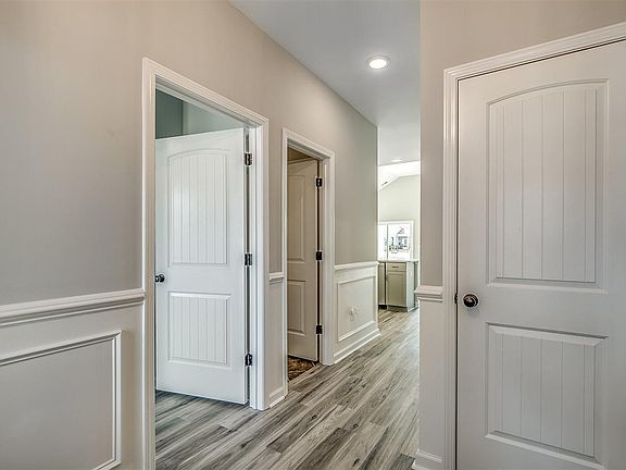 Dark grey stone and 2-tone grey siding accents create a lovely entry to your home. The foyer and hallway are graced with judges panels and wainscoting. The entire home has LVP (Luxury Vinyl Plank) flooring in grey tones for easy maintenance and living. The entertainment area, consists of kitchen, dining and living space. The kitchen boasts varying grey veining quartz counters, grey cabinets with waste-basket cabinet, back splash of glass accent tiles in varying green/grey tones, stainless gas stove, microwave, and dishwasher. The front bedroom has an adjacent kitchen with grey cabinets, ceramic tile floor in a diamond pattern. the nearby laundry has grey ceramic tile floor in a straight pattern. The entertainment area with kitchen, dining and living space is overlooking a lake with a lovely fountain. The atrium door leads to a 8' x 12' covered porch and additional grill pad. The master bedroom, with vaulted ceiling leads to the en-suite bath with 5' shower with tile walls and glass tile accents. Dual sinks, drawer stack and framed mirror, with an adjacent large walk-in closet. Up the wood stained tread stairs you will find the third bedroom roomy enough for king bed on 3 walls; floored storage and walk-in closet and the en-suite bath with grey cabinets and grey tile in a diamond pattern. This may be the one for you... A natural gas community featuring Rinnai tank less hot water system, gas heat, and as an option gas cooking. Low HOA offers weekly lawn maintenance, semi-annual lawn fertilizer and mulch refresh, annual pressure wash, weekly trash pick up and bi-weekly recycle pickup, and resort style pool, cabana, clubhouse with gym, lending library, fully equipped kitchen, putting green,pickleball courts, boccie ball,and horseshoes.