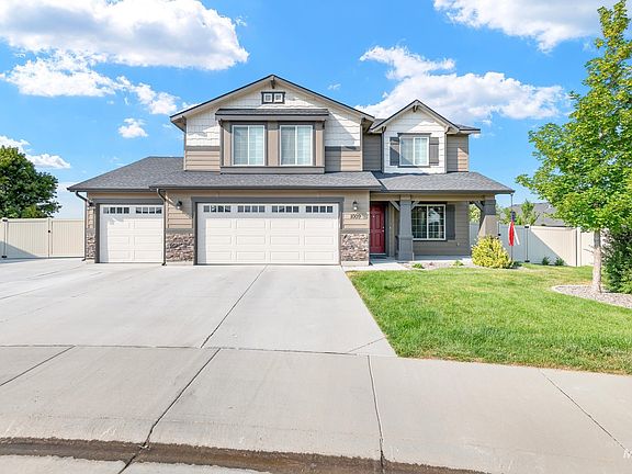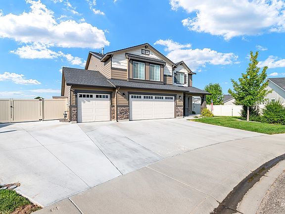 This spacious 5-bedroom, 2.5-bath home is a perfect blend of comfort, function, and fun! Set on an expansive lot with no backyard neighbors, the outdoor space is a true retreat—complete with a garden area, swing set, in-ground trampoline, and paved RV parking. Paid-off solar panels offer incredible energy savings, and the recently painted exterior gives it fresh curb appeal. Inside, the open-concept kitchen with granite countertops flows into a generous dining area—ideal for gatherings. The main level features a large living room, while an upstairs family room offers flexible space for relaxing or entertaining. Each bedroom includes a roomy closet, and the master suite boasts a private commode and oversized walk-in closet. The oversized 3-car garage includes an extended third bay—perfect for a workshop or extra storage. A convenient utility room is located just off the kitchen. Tucked in a peaceful neighborhood in the charming town of Kuna, this home offers privacy, space, and smart upgrades. Don’t miss it!
