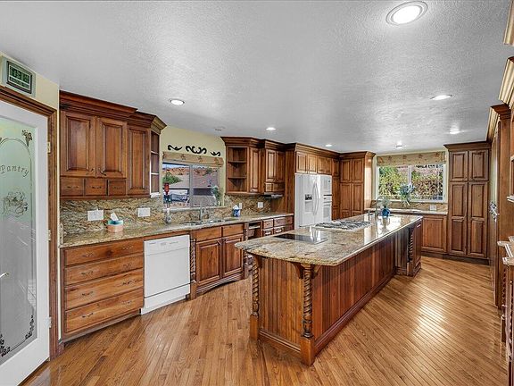 Seller Motivated! Charming estate style home offers ample space for everyone, multiple gathering areas, library, formal living room, sauna room off the primary bedroom, theatre room and storage room in basement as well as formal dining room. The heart of the home is the stunning kitchen, showcasing abundant cabinetry for storage, granite countertops, large island, gas cooktop and warm hardwood floors. Throughout the home you'll find an array of desirable features including vaulted ceilings, custom built ins, plenty of storage and cozy fireplace just to name a few. The private backyard is desert oasis with fenced pool, spiral staircase that leads up to sauna room, attached workshop area, garage with walk in freezer, and detached workshop/storage room with extra storage in the attic.