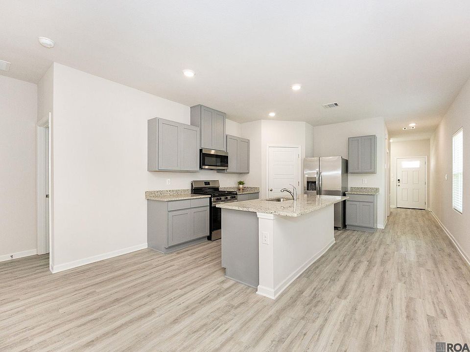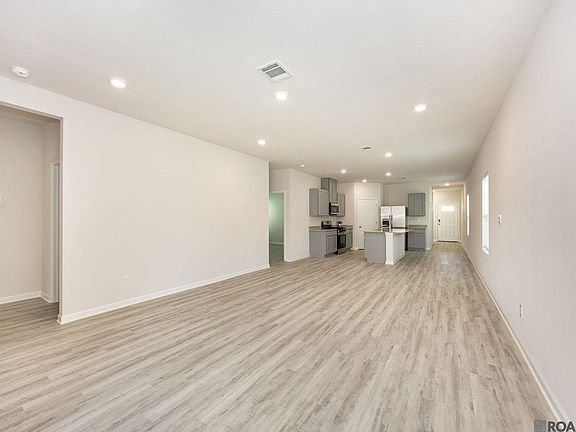 Welcome Pelican Lakes, a new home community in Baton Rouge, Louisiana. Inside this 4 bedroom, 2 bathroom home, you'll find 1,610 square feet of enjoyable living. Once you walk into this home, you'll see two bedrooms along with the guest bathroom. Walking down the foyer, you'll see another bedroom down a short hallway, that houses the HVAC system and the linen closet on the other side. The kitchen offers shaker-style cabinets, gooseneck pulldown faucets in the kitchens. The chef in your group will also enjoy the stainless-steel Whirlpool appliances, gas stove, microwave hood, dishwasher, single basin undermount sink. and 3 cm granite throughout. The kitchen also houses a large corner pantry, and the separate laundry room is located on the other side, creating easy access to everything. The dining room is adjacent to the kitchen, and the living room is situated nearby. This smart layout ensures that anyone can always be part of the action, regardless of their location. Whether you need a space for entertainment, storage, hosting guests, relaxation, or fitness activities, you can count on feeling comfortable and content. The primary bedroom is in the rear of the home and has its own en suite. The primary bathroom features a double vanity with a tub/shower combo, large walk-in closet, separate linen closet, and a separate water closet. Get in touch with us now and schedule a tour today!