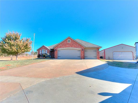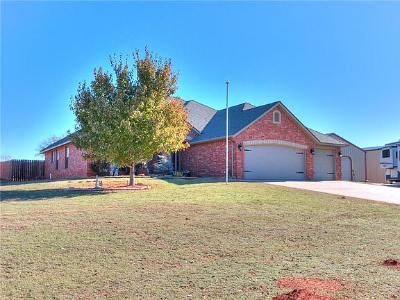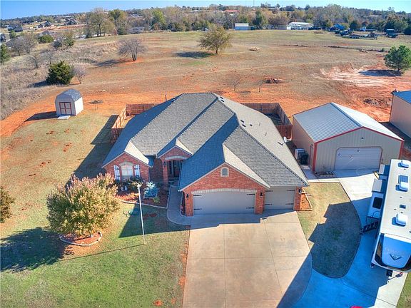 Beautiful 3 Bed PLUS Study home on 1.5 acres mol has 30x30 shop w/electric & 50 amp plug, storm shelter & nice views. Open living area has gas log fireplace, crown molding & ceiling fan. The kitchen has breakfast bar, granite counter tops, SS appliances & a good size dining area. In the primary bedroom you'll find a full bath w/marble top vanity, jetted tub, tile shower & walk-in closet. The Study has a closet so could be utilized as a 4th bed, if needed. Additional amenities include new carpet in 2021, fresh interior paint 2022, window treatments, security system w/outdoor cameras, stockade fencing and a 10x10 storage building.