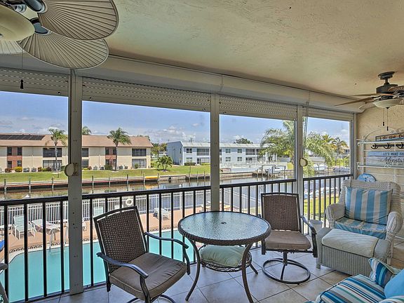 Grab the beach towels and chairs and head out to Southwest Florida's pristine shoreline at spots like Sanibel Island, Fort Myers Beach, and Lovers Key State Park, all just a stone's throw from this condo! The 2-bedroom, 2-bathroom vacation rental ensures you'll have a hassle-free escape highlighted by a community pool, a spacious screened-in balcony, and charming beach-themed decor. For delicious dinners or late-night bites, you'll be within walking distance of Cape Coral's best restaurants. The Property Remote-Work Friendly | Peaceful Canal & Pool Views | Walk to Restaurants This condo, nestled in the bustling downtown area of Cape Coral, is the best destination for your next friend group getaway or couple's retreat to Florida's Gulf Coast. Bedroom 1: King Bed | Bedroom 2: Queen Bed OUTDOOR LIVING: Community pool (open year-round, depth 3' - 6'), screened-in balcony, flat-screen TV, ceiling fans, patio furniture, beach chairs & towels, canal access INDOOR LIVING: Smart TVs w/ cable, beach-themed decor, ceiling fans, dining table, desk workspace KITCHEN: Fully equipped, Keurig coffee maker, espresso machine, knife set, water filter, bar seating, toaster, cooking basics GENERAL: Free WiFi, central heating & air conditioning, washer & dryer, linens & towels, hair dryer, keyless entry FAQ: 1 Ring doorbell (facing out), stairs required to access (2nd-floor unit) - Must be at least 25 years old to book - Additional fees and taxes may apply - Photo ID may be required upon check-in - NOTE: The property requires stairs to access - NOTE: Your safety matters. This property features a Ring doorbell device with an exterior security camera facing the front outdoor entry. The camera does not look into any interior spaces. The camera actively records video when motion is detected by the device or when the video doorbell button is pressed Grab the beach towels and chairs and head out to Southwest Florida's pristine shoreline at spots like Sanibel Island, Fort Myers Beach, and Lovers Key State Park, all just a stone's throw from this condo! The 2-bedroom, 2-bathroom vacation rental ensures you'll have a hassle-free escape highlighted by a community pool, a spacious screened-in balcony, and charming beach-themed decor. For delicious dinners or late-night bites, you'll be within walking distance of Cape Coral's best restaurants. The Property Remote-Work Friendly | Peaceful Canal & Pool Views | Walk to Restaurants This condo, nestled in the bustling downtown area of Cape Coral, is the best destination for your next friend group getaway or couple's retreat to Florida's Gulf Coast. Bedroom 1: King Bed | Bedroom 2: Queen Bed OUTDOOR LIVING: Community pool (open year-round, depth 3' - 6'), screened-in balcony, flat-screen TV, ceiling fans, patio furniture, beach chairs & towels, canal access INDOOR LIVING: Smart TVs w/ cable, beach-themed decor, ceiling fans, dining table, desk workspace KITCHEN: Fully equipped, Keurig coffee maker, espresso machine, knife set, water filter, bar seating, toaster, cooking basics GENERAL: Free WiFi, central heating & air conditioning, washer & dryer, linens & towels, hair dryer, keyless entry FAQ: 1 Ring doorbell (facing out), stairs required to access (2nd-floor unit) - Must be at least 25 years old to book - Additional fees and taxes may apply - Photo ID may be required upon check-in - NOTE: The property requires stairs to access - NOTE: Your safety matters. This property features a Ring doorbell device with an exterior security camera facing the front outdoor entry. The camera does not look into any interior spaces. The camera actively records video when motion is detected by the device or when the video doorbell button is pressed