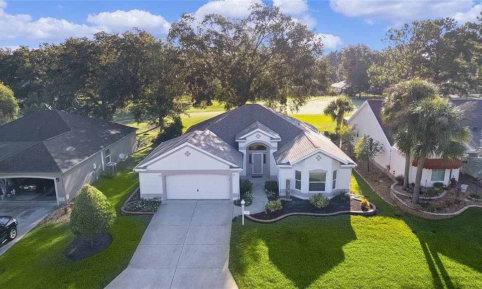GOLF FRONT! SUNRISES, SERENITY and BIRDS AWAIT! Discover your perfect retreat in this lovingly maintained one-owner Block & Stucco LANTANA Designer home which is ready for immediate occupancy. Nestled on the #2 hole of the Lakes, one of the three HACIENDA Championship Golf Courses, enjoy tranquil mornings on the enclosed lanai as the sun rises...and delight in the activity the birdbath provides. Spanning over 2,000 square feet under air, this 3-bedroom, 2-bath layout is one of the most sought-after floor plans in The Villages! Need extra garage space? Look no further—this EXPANSIVE GARAGE measures 24’ w x 27’ d, easily accommodating 2 cars and 2 golf carts +++ (see pictures). Step inside to find a neutral palette, perfect for your own personal touches. The OPEN kitchen features an abundance of white cabinets with pull-out shelves, a closet pantry, and a spacious breakfast bar ideal for casual gatherings. The generous living area seamlessly flows through sliders to the acrylic-enclosed lanai, providing a serene escape for relaxation. The Primary Suite is a true retreat, boasting a large walk-in closet, an en-suite bath complete with his/hers sinks, a privacy commode, tiled shower, and a luxurious soaking tub—pure bliss! The front guest bedroom shines with a charming bay window, while both guest rooms offer ample closet space. The guest bath features a tub/shower combo with a sliding glass door. The laundry room comes equipped with washer, dryer, utility tub, and a built-in office nook, perfectly tucked away for privacy. Elevated by VAULTED KNOCKDOWN Ceilings (no popcorn!), this home is filled with thoughtful extras, including window blinds/shades, gutters all around, attic stairs, insulated garage door, and keyless entry. The ROOF was replaced in 2020, and the BOND is PAID. Located in the Village of Hacienda South on a peaceful loop with no thru-traffic, you’ll have effortless access to all that The Villages offers—golf, pickleball, nightly music and restaurants at Spanish Springs and Lake Sumter Landing Town Squares, pools, major medical facilities, shopping, and so much more! So, what are you waiting for? If not now, when???
