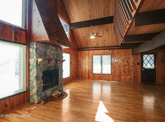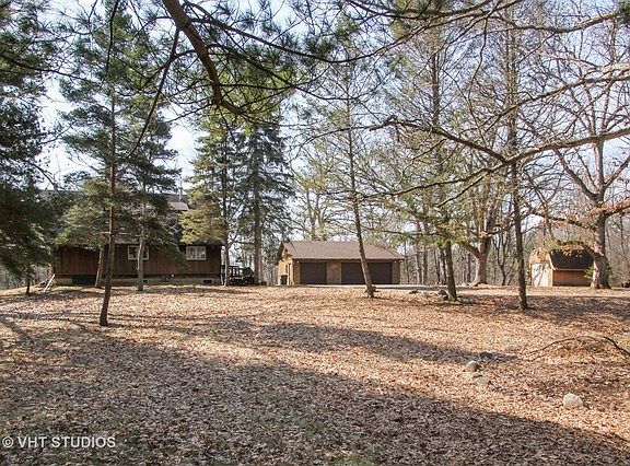 Vacation or everyday living can be found on this great wooded 5 acre lot. Enjoy this custom homes location in the woods. Exposed beams and knotty pine walls, hardwood floors throughout the main floor. Large windows to look out and see nature. Stone fireplace in the main living space. Outside access from the basement. Unfinished basement waiting for you to finish what best suits your life style. 3-car garage and large shed.