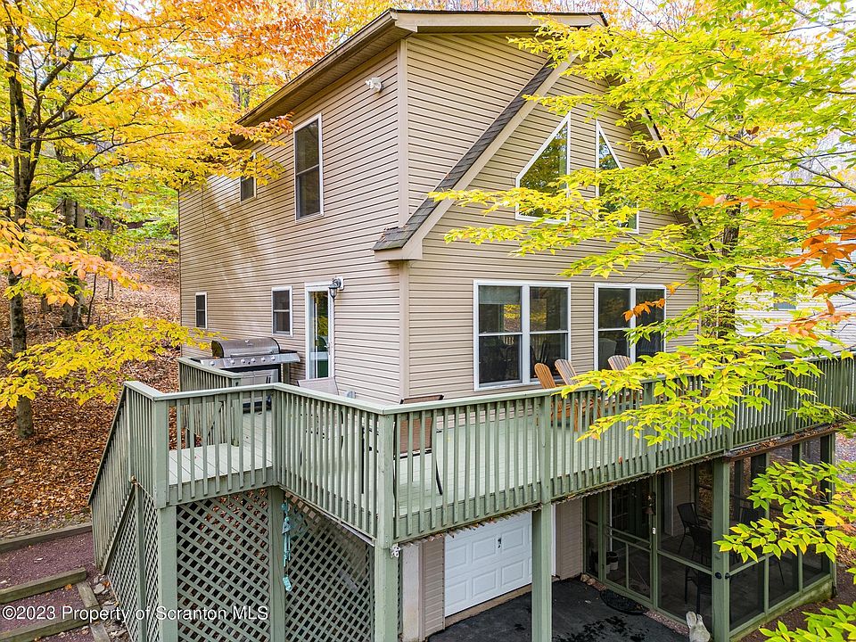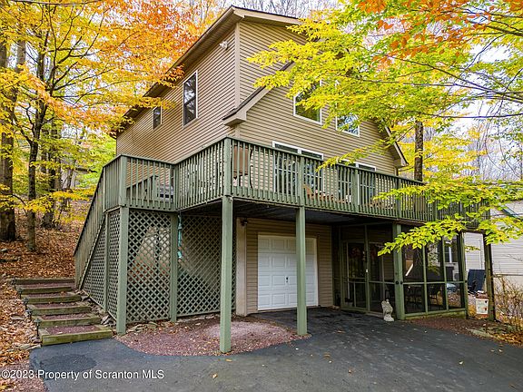 Welcome to your dream retreat nestled in the serene Wallenpaupack Lake Estates. This captivating chalet-style home with a wrap-around deck is surrounded by hardwoods and is less than a 10-minute walk from the Beaver Lake beach and picnic area, allowing you to truly immerse yourself in nature's beauty.This charming residence boasts three bedrooms and two and a half bathrooms, providing ample space for you and your loved ones. With a one-car garage and a finished basement, including a cozy family room, laundry room, workshop, and half bath, this home offers both functionality and versatility. The top floor includes a bonus space off one of the bedrooms that could be used as an office, nursery, or large walk-in closet.Impeccably maintained with love and care, this chalet showcases a perfect blend of rustic charm and modern comfort. The open and inviting living spaces create a warm and welcoming atmosphere, perfect for relaxation and entertaining.As a resident of Wallenpaupack Lake Estates, you'll have access to an array of exceptional amenities. Enjoy friendly matches on the tennis and volleyball courts, or gather your friends for a game of baseball or soccer on the spacious fields. Cool off during the summer months with a refreshing dip in one of the three swimming pools, or explore the tranquility of the two smaller lakes nestled within the community. Additionally, you'll have convenient access to the renowned Lake Wallenpaupack, offering endless opportunities for boating, fishing, and water activities.Don't miss out on this incredible opportunity to own a chalet-style home in the sought-after Wallenpaupack Lake Estates. Embrace the beauty of nature, indulge in community amenities, and create unforgettable memories in this meticulously cared-for property.All furniture is included except living room and dining room which is negotiable. Schedule your private showing today and experience the allure of this extraordinary lakeside retreat., Baths: 1 Bath Lev 1,1 Half Lev L,1 Bath Lev 2, Beds: 1 Bed 1st,2+ Bed 2nd, SqFt Fin - Main: 829.95, SqFt Fin - 3rd: 0.00, Tax Information: Available, Dining Area: Y, Semi-Modern Kitchen: Y, Sewer Comm Central: Y, SqFt Fin - 2nd: 457.89, Additional Info: All furniture included except for living room and dining room which is negotiable.