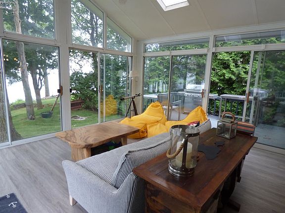 West Shore living at it's most luxurious. Enjoy incredible views while entertaining guests. Eclectic themes throughout...This cottage is perfect for engaging family and friends. Its open concept kitchen is ideal for concocting and connecting with those who appreciate amazing views of Lake Erie. Enjoy Balian themes boasting contemporary teak floating shelves, an impressive Suar wood island, and surrounding white quartz counter tops. Easily prepare foods utilizing modern conveniences including a Viking cook top induction stove, Bertazzoni oven, and a double drawer under mount refrigerator. Sunset lake views amaze from the 3 season room furnished with a buffet boat from Bali. Bedrooms are themed accordingly including rear quarters reflecting classic nautical. This cottage reflects a true lake cottage lifestyle. Enjoy easy access down to the water and your private beach. It is turn key and ready for your own Put-in-Bay experience.