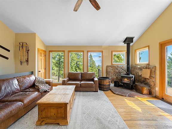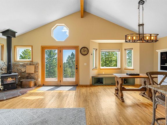 Tucked away on a peaceful 1-acre lot, this beautiful Conifer home offers the ideal balance of privacy and convenience—just 10 minutes from groceries, shops, and restaurants, yet it feels a world apart from the daily hustle. Designed for true mountain living, the sun-drenched, south-facing lot features spectacular mountain views and multiple outdoor spaces that invite you to relax and enjoy the natural surroundings. Recent updates include a new roof (2024) and newer windows throughout, enhancing energy efficiency and peace of mind. Inside, vaulted ceilings and hardwood floors create a warm, open feel. The thoughtful, open-concept layout connects the kitchen, dining, and living areas, with large windows that frame the stunning views. The cozy living room is anchored by a wood-burning fireplace, while the kitchen offers stainless steel appliances and a convenient breakfast bar. The dining area is accented by charming bay windows. Two well-appointed bedrooms and a full bath complete the main level. The finished walkout basement adds a large and versatile second living area - complete with a kitchenette/wet bar, making it ideal for guests or entertaining. This level also includes a third bedroom, full bathroom, and a spacious laundry room with room for full-sized appliances and extra storage. Step outside to enjoy two well-appointed decks with spectacular views, a fire pit area perfect for making s’mores under the stars, and an oversized 2-car detached garage (2016) - offering plenty of space for storage, hobbies, or even a home gym. In addition to the garage, a large parking area accommodates guests and additional vehicles with ease. Backing to 400 acres of protected open space at Flying J Ranch Park, this home enjoys unparalleled access to nature with the peace of mind that it won’t be developed. With paved road access and just 28 miles to downtown Denver, this property is a true mountain retreat—offering peaceful seclusion without sacrificing modern convenience.