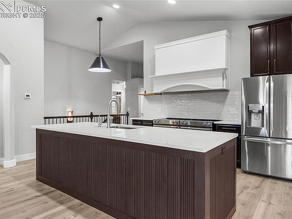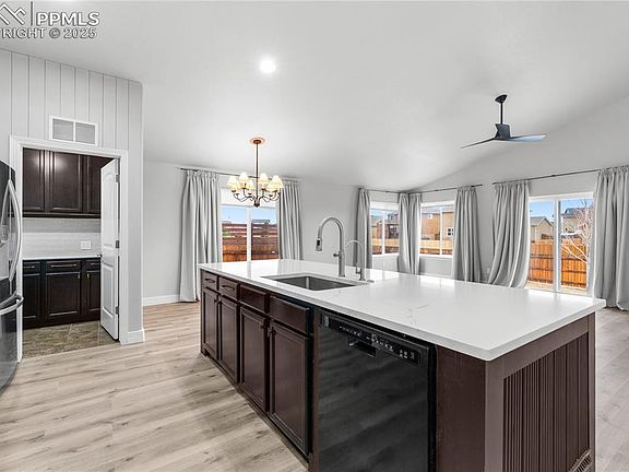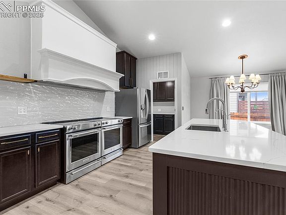 Welcome home to this spectacular 5 bedroom 3 bathroom ranch style home with easy access to Schreiver, Fort Carson and Peterson Air Force Base! This home has been beautifully updated throughout! Notice the gorgeous LVP flooring as you enter the home! Head into your new home to discover a chefs delight in the kitchen with an enormous quartz island with storage galore, TWO full sized gas ranges, a gorgeous hood, butlers pantry for additional cabinetry, and tons of counter space for the chef in your family! The spacious living room offers a built in fireplace, ceiling fan and attached dining area! Head out to your huge backyard to discover a fully landscaped yard with a storage shed included as well as stamped concrete walkways! The main level boasts a gorgeous primary suite with stylish barn door, a large walk-in closet as well as a 5 piece bathroom with soaking tub! There are two additional bedrooms on this level as well as a nice sized full bathroom! Head on downstairs to your lower level to find a huge family room with newer carpet as well as two additional bedrooms, one with a large walk-in closet as well as a full bathroom. The large storage area also houses your easily accessible laundry area as well as a water filtrations system! Additional concrete driveway for more off street parking! With A/C for those warm Colorado summers, There is nothing left to do here but move in!