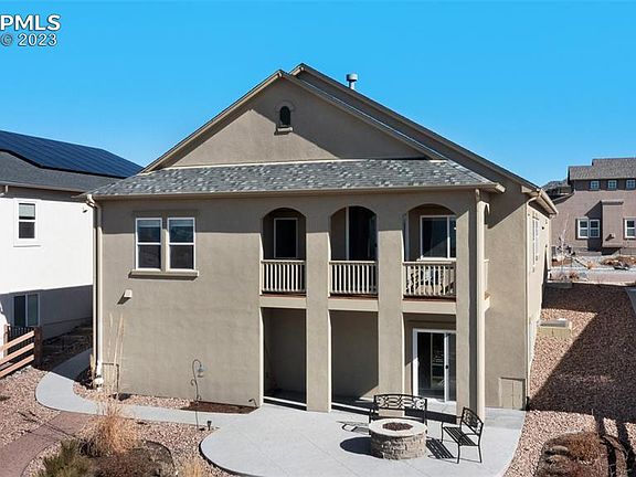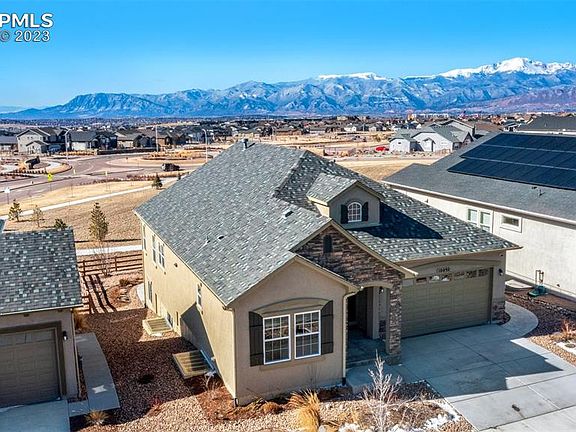 Views, Views Views! Amazing walk out ranch home with unobstructed centered views of Pikes and Pike and the Front Range with open space behind! This is the dream home you have been looking for —incredible upgrades and an open floor plan. Large open gourmet kitchen with gas range, second oven, microwave, huge island, and under cabinet lighting. Spacious great room with jaw dropping views and fireplace, with split face stone surround. An ideal primary bedroom, also with Pikes Peak views. Attached bathroom with large freestanding shower, double vanities and a large walk in closet. Plantation wood stained shutters, pleated shades and hardwood floors through out much of the main floor. Practical main floor office/bedroom with french doors. Downstairs a full finished Giant basement with 2 large bedrooms and bathroom. Expansive Rec Room (40x19) with room for entertainment/theater area and game/craft table space. Framed and roughed in area (8x8) for a future wet bar or kitchenette. Unbelievable outdoor living spaces. Incredible covered deck off the main floor. Stamped concrete patio from the back slide with built in gas fire pit mostly fenced yard. Enjoy the savings of the zero scaped yard, but experience the expansive community green space behind. Short walk to Wolf Ranch Lake, Valemont Park and Braden Park. Custom treated garage floor and painted walls. Home security system and may other up grades through out! HOA due include clubhouse and pool membership.
