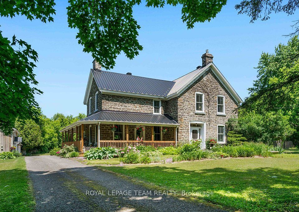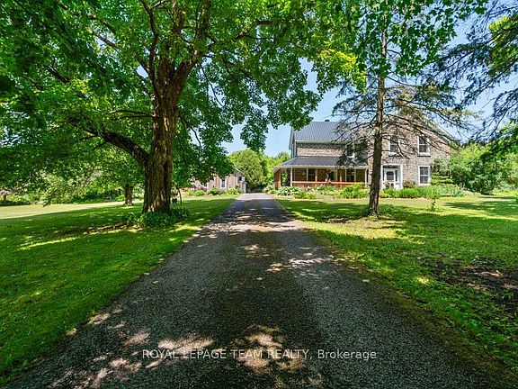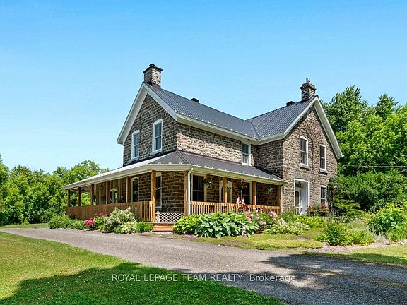 Timeless Stone Estate on 74 Acres of Pure Charm. This property includes a 3 Bedroom, 2.5 bath main home and a 3 Bedroom, 2 bath Guest house. Step back in time without giving up a single modern luxury in this stunning stone home originally built in 1876, beautifully preserved and thoughtfully upgraded to blend historical character with todays conveniences. This property also has a 3 Bedroom/2 Full Bath Guest House with it's own Furnace and Electrical. Nestled on 74 private acres with meticulously cleared trails (approx 5km worth!), this breathtaking estate is truly one-of-a-kind. From the moment you step inside, you'll be greeted by original pine floors, old time character and a warm, inviting atmosphere. The main floor boasts a cozy living room with a wood-burning stove, perfect for crisp evenings, and a powder room cleverly tucked beneath the stairs. The former summer kitchen has been fully insulated and transformed into a chefs dream complete with granite countertops, reverse osmosis system, and a classic gas AGA stove offering additional heat and featuring two burners and FOUR ovens, ready to handle anything from Sunday roasts to holiday feasts. The kitchen entrance also has heated flooring. Upstairs, you'll find three bedrooms, including a private primary suite with its own staircase, a tranquil ensuite bath with heated floors, and thoughtful details throughout. The second level also features a 4-piece bathroom, plus a unique Jack and Jill bathroom offering smart storage and a hidden washer/dryer for added convenience. The exterior is just as dreamy, featuring a newly built porch and railing, 20 x 40 in-ground pool with new stonework, liner, and diving board, surrounded by a relaxing gazebo and tranquil pond. There is a pool heater but not connected or installed (though never used by the sellers), making it easy to extend swim season if desired.