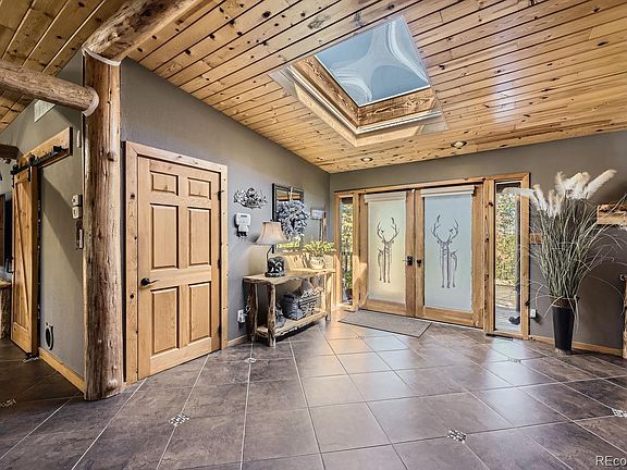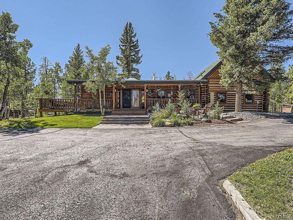 This 1930's log cabin has been completely updated offering the charm and nostalgia of that era with the modern conveniences you want and need. Perfectly situated on a private, one acre lot, fully fenced in (including an invisible fence for pets) and filled with pine trees, aspen and abundant wildlife. Interior features a great room with log beams, vaulted ceilings, built in entertainment center, wood burning stove, skylights with remote control blinds, 3 sets of french doors that open to the wrap around porch. The kitchen has a beautiful island, upgraded countertops, gorgeous backsplash and newer appliances. There is an updated bathroom for guests as well as a jack and jill bathroom connecting the main floor bedrooms. The large laundry/pantry area features a built in sink and additional cabinets/shelving for abundant storage. The master suite is up the spiral staircase, with a fully remodeled bathroom including free standing tub, large walk-in closet and more beautiful views. The three car garage doors are brand new and the garage is heated with a workbench. The flat driveway provides plenty of additional parking. The stamped patio and walkway up to the house is heated for easy snow melt. As well as heat tape on the roof and gutters. Metal roof and newer windows throughout. The best part? This home boarders Jefferson County Open space with easy access to Flying J Ranch Park and its 422 acres of trails for hiking, biking or horseback riding. Minutes to conifer, easy access to downtown Denver (35 min), Red Rocks (20 min), Chatfield (30 min), DIA (55 min).