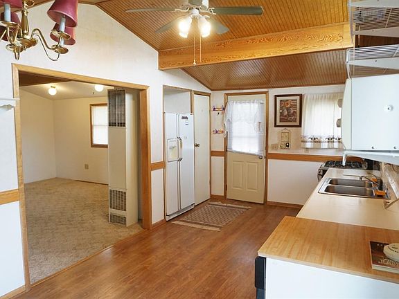 Great starter home or investment property on a HUGE corner lot! This 2 bedroom, 1 bathroom home is complete with a double detached garage, 2 apple trees, a patio, deck and garden spot. It's conveniently located just 2 blocks from South Broadway. The home has an open layout with vaulted ceilings and beams. The kitchen is adorned with windows including angled windows above the cabinets and large corner windows in the dining room that fills the room with natural light. The kitchen also includes updated laminate flooring, a double-oven gas stove (along with a refrigerator, microwave and dishwasher) and a pantry. Just off the kitchen is a nice-sized carpeted living room, two bedrooms, a full bath and laundry room. Watering your lawn and garden will be no problem with the usable cistern! The 4-ft crawl space was recently insulated and protected with plastic and new shingles were installed on the house in 2016. The double stalled detached garage has lots of built-in shelves for storage, lights and a door opener. The large lot leaves plenty of space for RV parking.