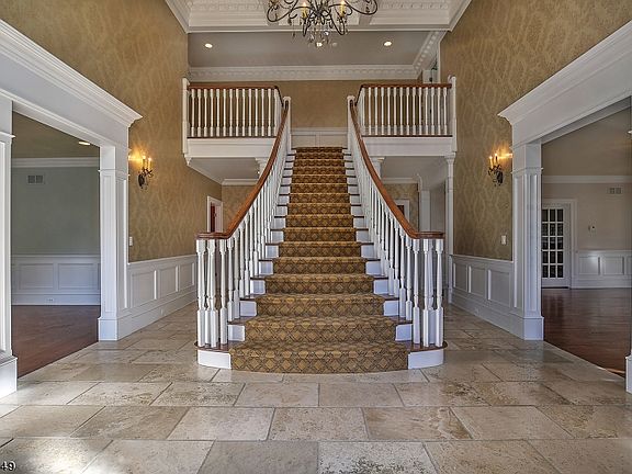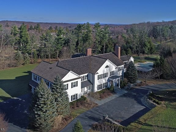 Understated Elegance beautifully nestled on a quiet Mountain cul-de-sac A private road on esteemed Bernardsville Mountain provides the setting for this beautiful Federal-style home. Estate fencing encloses this offering's five acres of lawn, mature trees and abundant landscaping. A wood shingle roof and clapboard siding envelope the home's grand dimensions allowing for 18 rooms including 6 bedrooms. Indoors Federal style's signature décor is given a sweeping palette in the 2-story foyer and throughout. Corbels augment carved multilayered crown molding. Elegant headers and fluted casings trim entries while columns and arches define spaces. Wainscoting lines walls and staircases. Comfortable and functional design define the gracious floor plan. To the right of the foyer the living room presents the first of the home's four fireplaces. The cherry library sports a magnificent coffered ceiling, built-ins and a window wall stretching its length. A teak paneled cathedral ceiling rises in the solarium, light streams from its banks of windows. Another window wall and fireplace prevail in the spacious family room; wide-spaced arches define the open flow to the kitchen. A 13-foot island centers the latter, the Hampshire cabinetry is flush with custom features and breakfast takes place amid views to the spectacular private grounds. On the second level a sitting room with refreshment station accompanies the master bedroom and the luxurious bath may well be a dream come true. Four additional bedrooms, all en suite, and a sizeable laundry room are here as well. A staircase heads from the hall to the third level with expansive sitting room, bedroom and bath. The home's finished lower level hosts a theater; video game, recreation and exercise rooms; bath and multiple utility and storage rooms. No less impressive is the pool with pool house. Multiple French doors open from the home to the fully fenced complex. A travertine deck frames the 40' x 20' heated, saltwater pool inset with sun bathing deck. Echoing the architecture of the main residence, the structure features a cathedral ceiling sheltering the open dining area/lounge with fireplace. Indoors are a full bath, changing and storage rooms. Known throughout the metropolitan area for its estates and historical mansions, Bernardsville is also prized for its excellent schools and ready access. Manhattan bound trains are available at the town's historical train depot and nearby highways provide easy access to the State's corporate centers.