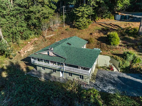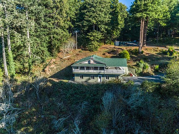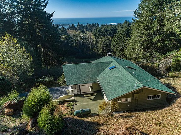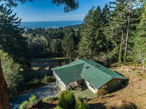 Trinidad Cove- Excellent location for this Chalet style home & redwood studded 2+ acres perched on a hilltop across the street from Trinidad State Beach & College Cove, offering amazing coastal access, beautiful ocean views & sunsets over the Pacific. This special property offers a wonderful vantage point for this incredible section of coast, yet is conveniently located a short walk or bike ride to the village of Trinidad. Rustic beam construction & a fireplace warm the living room that opens onto a large sunny covered deck for enjoying rainy days & evenings outside. The kitchen is open & bright, cook at your gas range while enjoying the ocean views & connecting with family. This hilltop hideaway is wonderfully private, near the end of a winding paved lane, quiet & dreamy.