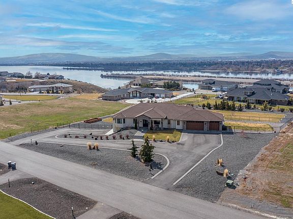 MLS# 267460 Commanding views plus ultimate comfort and luxury in this 4 BR 5 BA + an office home in North Pasco w/panoramic views overlooking Columbia River/surrounding area and offering 3100+ square feet of main-level living PLUS an additional 1574 square foot lower-level, climatized shop--all on a peaceful and beautifully landscaped 1.28 acre lot! Double-door entry invites friends and family alike into this masterfully designed Jeff Renz built home. Step into the welcoming foyer and take in the warm hickory engineered hardwood floors that draw you in to the picturesque great room w/large windows, gorgeous views, and boasting wood beam ceiling, built-in entertainment wall, and focal point stone-surround fireplace perfect for cozy gatherings. Love to entertain? The chef will delight in preparing both casual meals and formal menus in the showpiece gourmet kitchen--expansive counter space, natural quartzite counter tops w/waterfall edges, 8-foot island w/prep sink, professional Thermador appliances, cabinet front fridge w/touch-sensor smart handles, bar w/wine fridge, pull-out stand mixer drawer w/outlet, and a 9x6 walk-in pantry. Den/office off entry, gorgeous half bath for guests, and whole house (outside also) Sonos sound system. Private primary suite is an oasis for relaxation and has slider to patio as well as separate side yard access. The oversize luxury bath boasts double vanities (pull out drawers w/built-in outlets for convenient hair tool storage), spacious walk-in closet, tile galore, and spa-like walk-in shower w/dual heads as well as rainfall shower head. Love dogs? Separately fenced side yard, built-in pet doors, and tiled dog bath in laundry room! Premium outdoor enjoyment awaits on the expansive patios/decks--have a quiet morning with a cup of coffee or a large sunset BBQ for family and friends. Beautiful covered deck area w/outdoor fireplace, ceiling fan, and exterior heater to extend your outdoor enjoyment seasons! Soak under the stars in the hot tub, relax and read a book on the patio near the picturesque waterfall, pick fresh veggies from the raised bed garden area, or set up an array of yard games to enjoy on the expansive lawn. Want a pool: Lots of space to add one! Attached 3-car garage with freshly epoxied floors and built-in cabinet storage! The lower-level climatized shop has a 43x26 shop bay for toy/boat storage, half bath, storage room, and a 17x13 recreation cave (currently cigar room complete with air exhaust system).