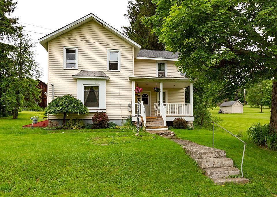 Fantastic farmhouse and barn in a country village setting waiting for you to enjoy. Home sits on a 1.6 acre corner lot with tons of space to grow into. The large barn and property are perfect if you like to garden or raise chickens perhaps. The home itself has an updated feel especially highlighted by the beautiful hand scraped bamboo floors. The main living area feels very open and you'll enjoy things like the new front porch with a cherry floor and all new insulated vinyl windows.1st floor BR converted to laundry. 4 BR upstairs. Save on taxes and live happily.