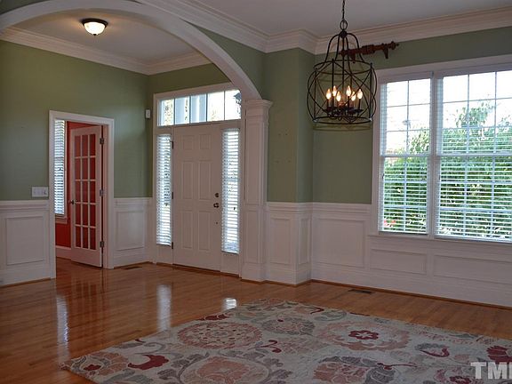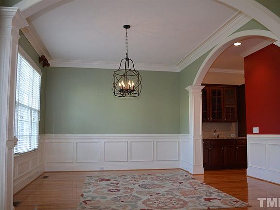 Style, quality, and detail meet comfort, convenience, and lots of space. Corner lot, side entry 3 car garage, and rocking chair wrap around porch. 10 foot ceilings, trim molding, wainscoting, decorative archways. Granite, large island, butler pantry, stainless in kitchen. Mud room. First floor office or second floor media/great room could be bedrooms. Fenced back yard, with stone seating area, and built in grill/bar. Home backs up to Green Hope Greenway which leads directly to the community pool.
