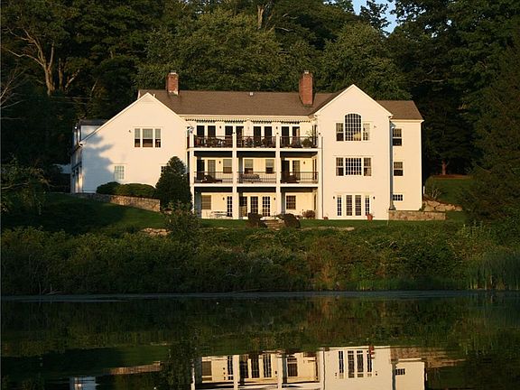 This gracious home takes full advantage of its stunning waterfront site, overlooking 300 protected acres of reservoir and watershed property. Multiple French doors and oversized windows offer spectacular views of the ever-changing New England scenery. Many rooms open onto large mahogany balconies or the expansive flagstone terrace. An elegant living room, library with wet bar, dining room, and airy gourmet kitchen with stone fireplace feature impeccable craftsmanship and mill-work. All rooms are beautifully proportioned and richly styled, yet wonderfully livable. Ideal for both daily life and entertaining. Convenient to town, train and major roadways, this welcoming home offers sophisticated comfort and convenience.