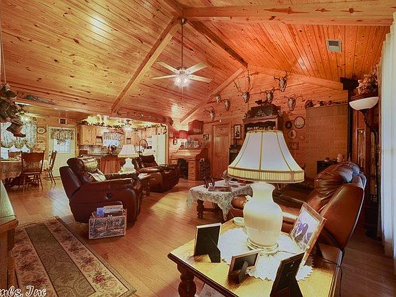 Gorgeous Lake Retreat on SIX acres! 2 beds in house & 2 baths in home. Most furniture can stay! 26x42 Shop w/3rd bedroom (needs to be finished),& full bath. RV hook ups. Quartz counters & tumbled stone backsplash in kitchen. Huge master with impressive walk-in closet! Great open floor plan. Lots of storage. Pine walls & ceilings. Vaulted family room. 4-wheeler trail to lake. Storm Shelter. Alarm system. Mineral rights, tractor, bush hog, box blade, rear tiller, & scoop all may convey with acceptable offer!
