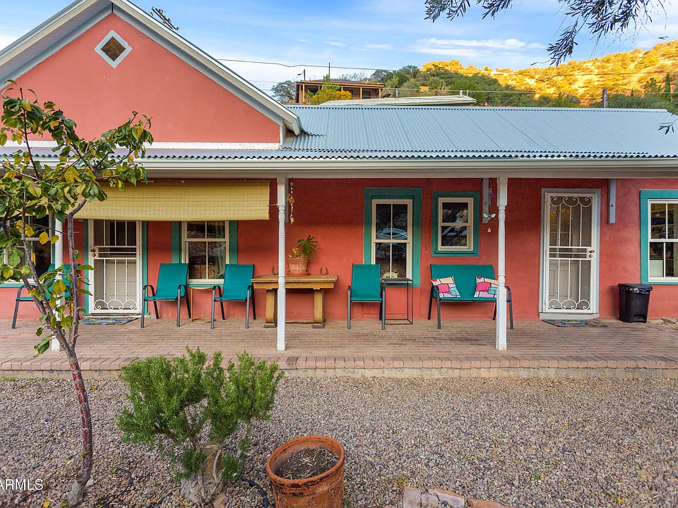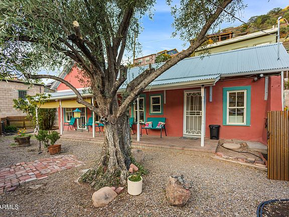 Old Bisbee charm abounds at this historic 2 bed 1 bath adobe beauty! Original wood floors nearly throughout, fully fenced yard with new corrugated metal fence and gate, metal roof (2016), recently serviced HVAC/mini splits, recently added tankless hot water heater, as well as new washer and dryer. This property is also mixed commercial (CM2) zoned and is just waiting for your business ideas!! The house is up approx one flight of stairs on the hillside with garage and THREE parking spaces down below. Original miner's quarters outside, complete with electricity, sewer and water, lots of possibility there. Just a short walk to Main Street and so many shops, bars and restaurants!! Built in 1900, this property is eligible for historic designation. Buyer to verify all facts and figures.
