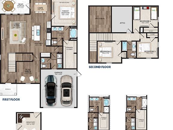This wonderfully designed plan has the primary suite on the main floor, a flex room (with an option to be a 5th bedroom, office/den/study or a formal dining space) and three additional bedrooms upstairs.. Additional features include a rear covered porch, two car garage, and a spacious open kitchen, dining and living room concept.
