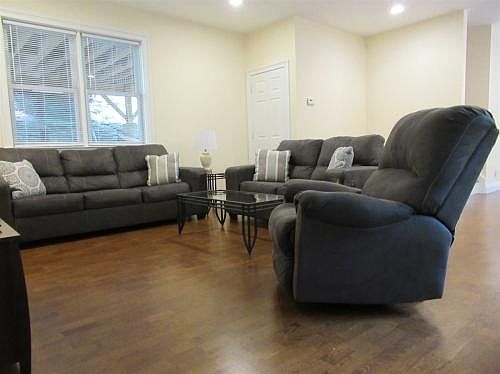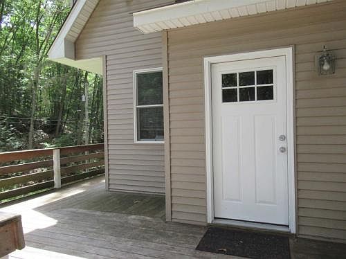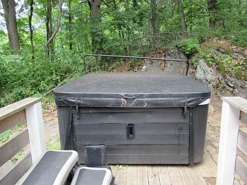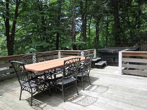 Nestled in between trees and rocks, privacy abounds in this Contemporary Colonial style dwelling with numerous upgrades. The home boasts generous open concept living, dining and kitchen all with recessed lighting. Kitchen includes rich cabinets, butcherblock counter tops and stainless steel appliances. Entry nook convenient for coats and shoes. First floor en suite bedroom and full bathroom with walk in ceramic tiled shower, great for guests or home office. 2nd floor, bright Family Room with hardwood floors, ceiling fans, vaulted ceiling and sliding glass door to large deck and hot tub for relaxing or entertaining. Primary Bedroom Suite with vaulted ceiling and roomy walk-in closet. Master Bath has an easy entry walk-in shower with ceramic tile. 2 more good sized bedrooms and laundry room round out the second floor. Built in benches on deck to quietly read or study the wildlife and additional picnic type area up the stone walkway. 1 car garage space included plus plenty of off street parking. Immediate occupancy. Home will be unfurnished, however current furnishings are available for additional rent. This is truly a place to call home where you can breathe