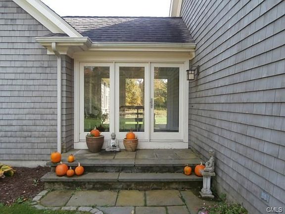 BURR MEADOWS Charming architect designed 2003 built Cape Cod with large covered porch and terraces overlooking three level acres in convenient Lower Easton/Greenfield Hill border just minutes to town. Features include Great Room with vaulted ceiling, wood floors and fireplace open to Kitchen with granite counters; elegant first floor Master Suite and glass Breezeway lead to second floor Bedrooms and bath. Perfect home for one level living or great expansion potential-6 bedrm septic, 400amp svc, city water +gas in area of million dollar homes on spectacular lot ..plenty of room for pool. Generator!