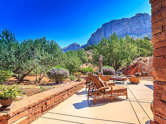 Majestic towering cliffs of Zion. The most spectacular sunrise & sunsets. Privacy for fantastic meals on the rear patio or kitchen. The custom home boasts endless upgrades. Huge windows shower the home in natural light. The bedrooms and baths give you that 5-Star resort feel. Game and wildlife abound on the property. This quiet neighborhood is only minutes from downtown Springdale. 15 minute walk