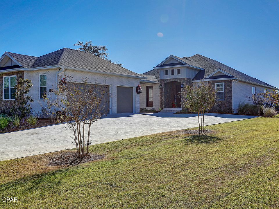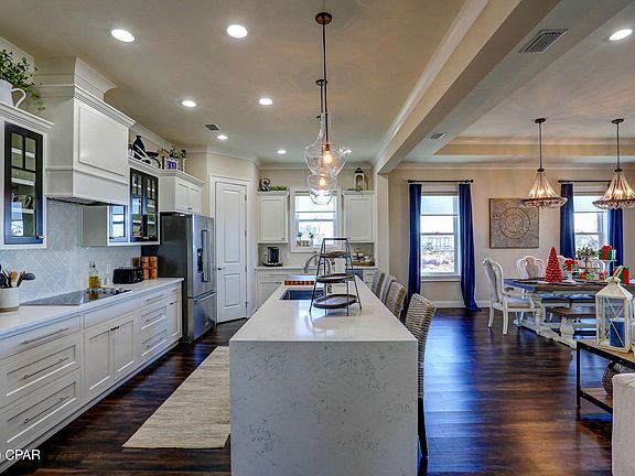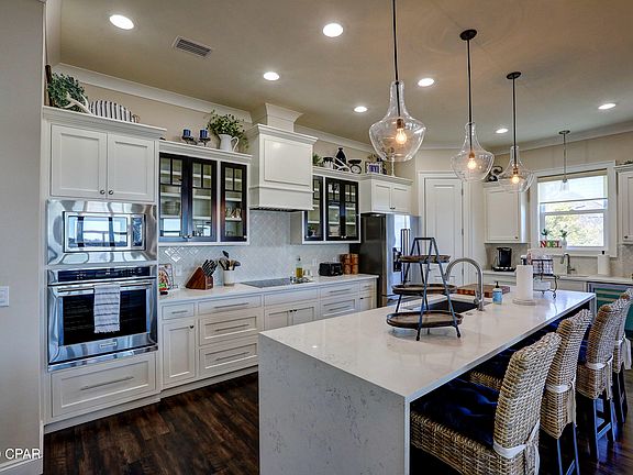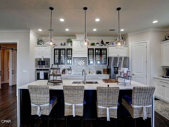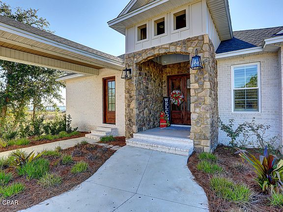 Video tour. Lynn Haven Bay Front home with panoramic views of North Bay on almost .5 acre lot. Interior of home features large living room, open kitchen with custom cabinets, large island, upgraded appliances, work sink, wine cooler and walk-in pantry, waterfront master bedroom with stand alone tube and wavy tile shower plus huge walk-in closet, 4th bedroom office, two additional bedrooms with access to bathroom, working laundry room, 4 panel glass slider to screened in 18 x29 covered porch with outdoor kitchen. There is a beautiful outdoor fireplace and seating area. There is a 20,000 lb boat lift and dock that has lighting, electricity, water and security cameras. There is a spacious 3 car garage, and fully landscaped yard. Security cameras on exterior and Control4 smart home technology.
