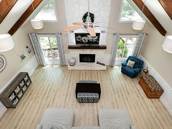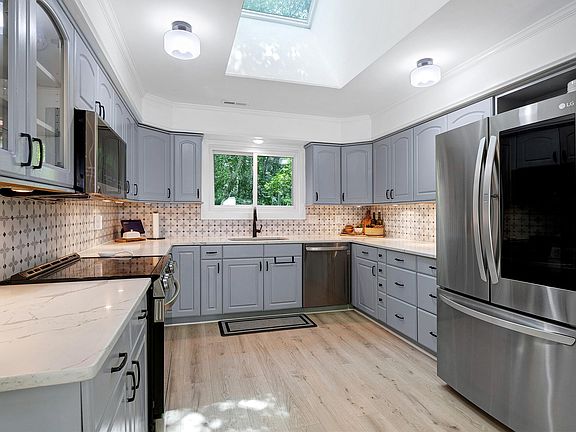Charming basement home with circular driveway nestled on a serene cul-de-sac with wooded surroundings and direct access to a greenway. This residence features a family room with vaulted ceilings, skylights in the kitchen, primary bedroom, and loft. A spacious basement includes a bedroom, kitchenette, bathroom, and rec room, complemented by a two-car garage. Beautiful decks. Roof replaced in two years ago. Enjoy the fresh appeal of new LVP flooring done this year, freshly painted interiors, and a luxurious tub and shower in the primary bathroom. Pool/Tennis memberships avialable at Kildaire Farms and Scottish Hills! Conveniently located in the sought-after Woods of Kildaire neighborhood!