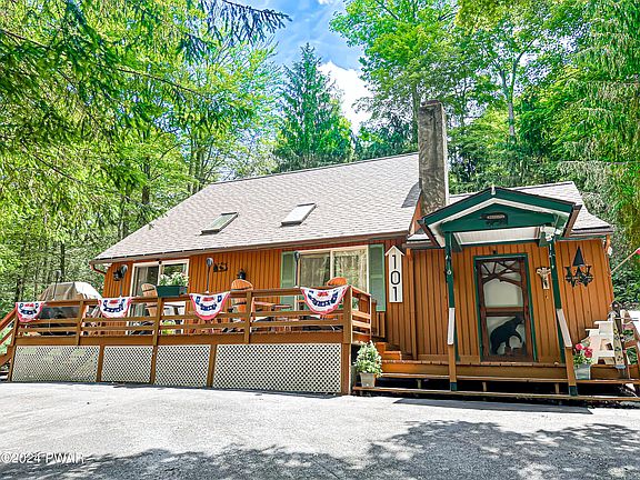 RUSTIC ELEGANCE - STUNNING CEDAR HOME RETREAT! Welcome ''home sweet home'' whether year round or just to enjoy your perfect get-away... This beautifully updated, 3BR/2 Full Bath, true cedar home has all the features that will make you fall in love. The spacious and open floor plan features soaring vaulted ceilings, all new kitchen w/ quartz countertops, kitchen island, & stainless gas appliance package, all new flooring throughout the 1st & 2nd floors, living room w/ floor to ceiling stone wood burning fireplace, GORGEOUS custom wood barn door leading to the full home length family room/office space, completely remodeled 1st floor bath w/ floor to ceiling tile shower, lovely open loft space leading to 2 upper bedrooms w/ balcony deck, walk-in closet, and ''jack&jill'' style shared bathroom, new lighting, and new energy efficient split units throughout. Nestled on a 1/2 acre, wooded corner lot on a quiet cul-de-sac. Plenty of deck space front AND back, outdoor fireplace, storage shed, landscaped garden area, and horseshoe paved driveway for plenty of parking. Close to all local and Poconos amenities. Neighborhood features private beach on 57 mile shoreline Lake Wallenpaupack with grand gazebo, lakeside BBQ, volleyball, boat docks, tennis, playground, smaller Tanglwood Lake access, basketball, nature trail, fitness center, garbage service, & security all included. Don't hesitate to schedule your appointment to view this perfect Poconos home today! Home can be available furnished, contact agent for details.
