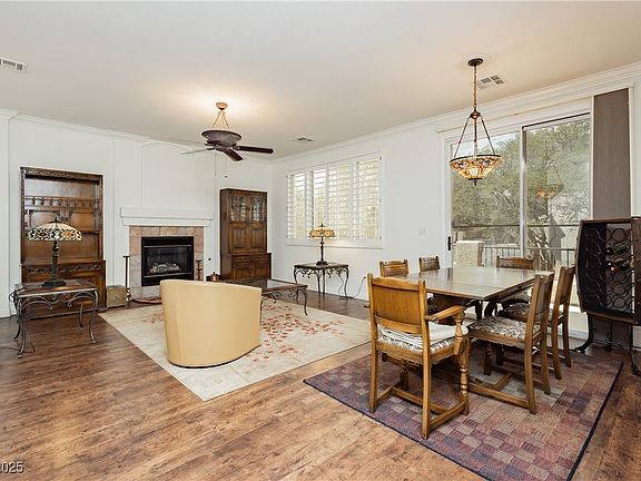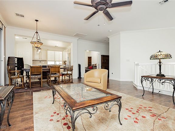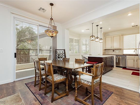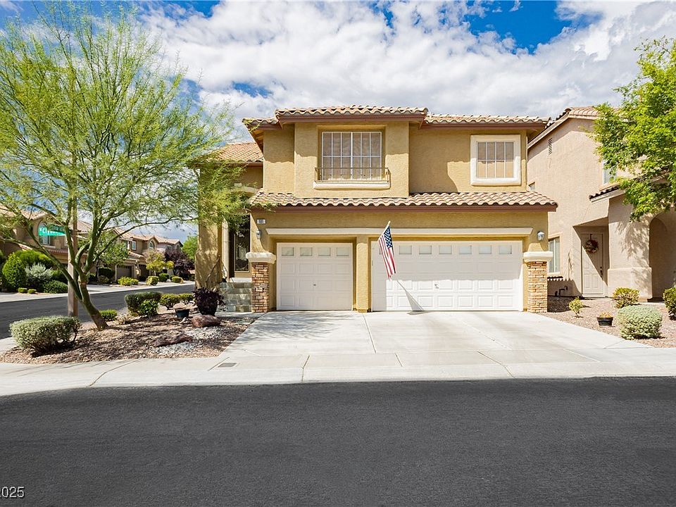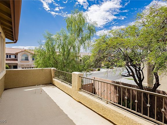Welcome to the Chardonnay subdivision in Summerlin! This spacious 4-bedroom, 2.5-bath, 2,079 sq. ft. split-level home offers a fresh look with brand-new interior and exterior paint. Situated on a corner lot. Top floor features the kitchen w/large island & nook, living room, two bedrooms, and 1.5 baths, with two TVs included. Downstairs provides two additional bedrooms, a full bath, and a kitchenette with refrigerator and sink (receipts available). The home boasts quartz and granite countertops, almond cabinets, shutters, window coverings, and porcelain plank in kit./ laminate flooring. Enjoy outdoor living with a covered patio, sun blinds, upstairs balcony, and umbrella that stays. Energy-efficient solar screens add comfort, while the 3-car garage with workshop, water conditioner, and water manifold system provide convenience. 220 AMPS in the breaker box, stove in downstairs kitchenette included but not connected. A rare find blending function, charm, and Summerlin style!