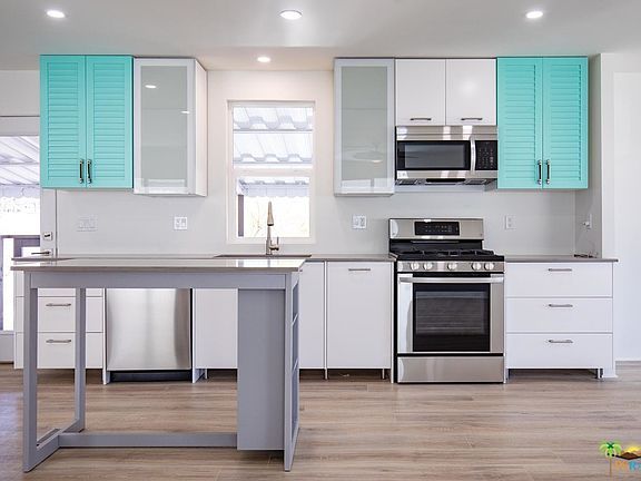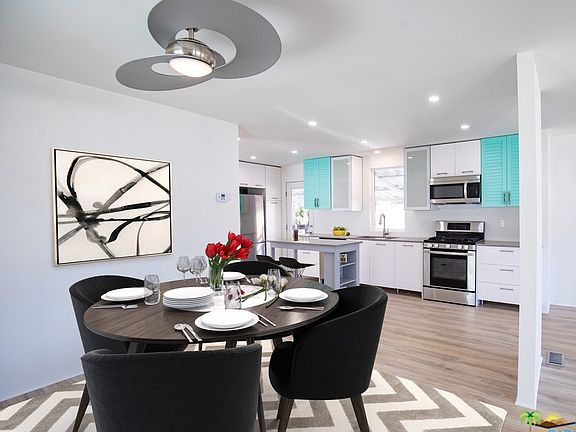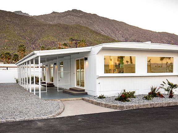 Not your grandma's mobile home. This vintage home has been transformed into a sleek modern 21st century residence. The new homeowner will enjoy the stylish contemporary design- gorgeous solid Pergo Max Premier flooring throughout, brand new kitchen cabinetry, a movable center island, & new appliances. Both bathrooms have been modernized with contemporary new tile, vanities and fixtures. The spacious floor plan provides ample living and dining areas. The 2nd bedroom is currently opened up, great for a den or tv room- but could be closed off easily- the addition of a closet would make it a good sized 2nd bedroom. The master suite includes a walk-in closet with washer/dryer hookups. New windows throughout, new roof, upgraded HVAC. Palm Canyon Mobile Club has been beautifully renovated, with gorgeous pool and spa area. The clubhouse includes a game room, lounge, party room, plus gym. Monthly space rent currently: $682.50. Cash only offers considered.