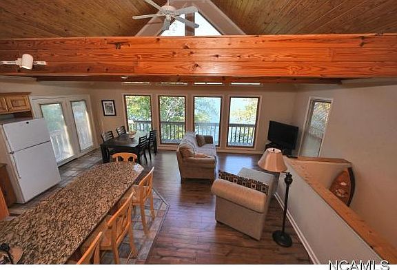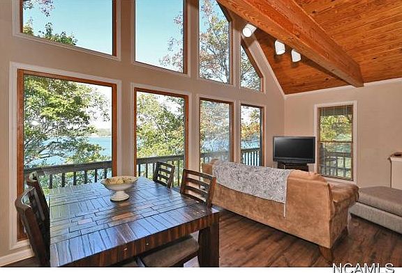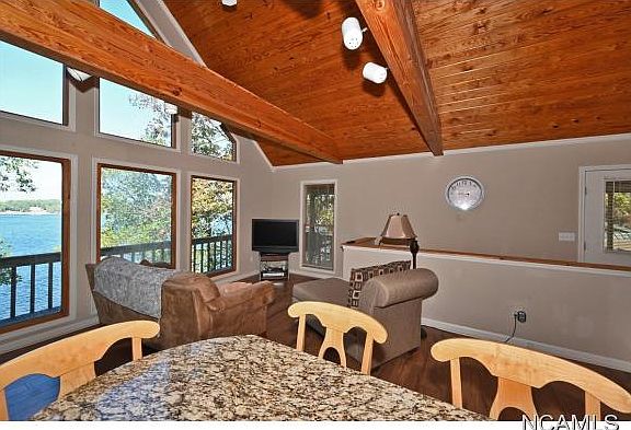 BREATHTAKING VIEW OF DEEP OPEN WATER AT ROCK CREEK ON SMITH LAKE FROM THIS COZY HOME. THE HIGH WOOD CEILINGS AND WALL OF WINDOWS MAKES THE VIEW ENJOYABLE FROM ALMOST ANYWHERE IN THE HOUSE. YOU HAVE AN OPEN LIVING AREA, 2 BEDROOMS, 1 BATH AND A LOFT UPSTAIRS AND A FINISHED BASEMENT WITH A BATH DOWNSTAIRS. BEAUTIFUL ROCK SHORELINE ALONG THIS LOT WITH APPROX. 50 STEPS TO A LIKE NEW COVERED BOAT DOCK/SWIM PIER INCLUDING 2 NEW JET SKI PORTS. THIS HOME IS ALSO FULLY FURNISHED!