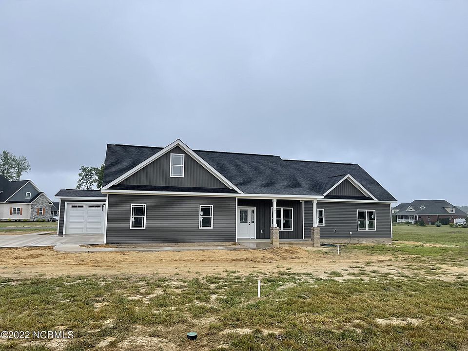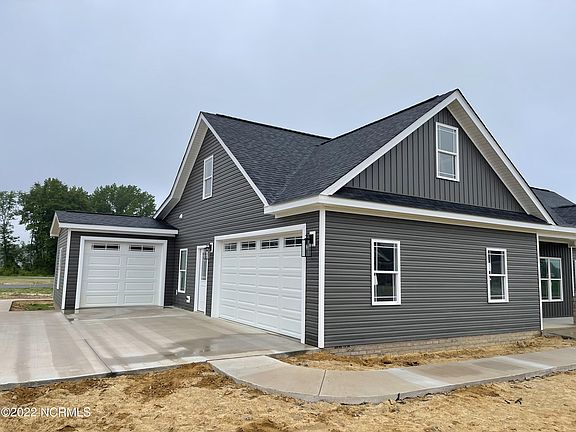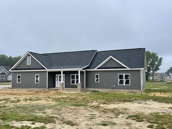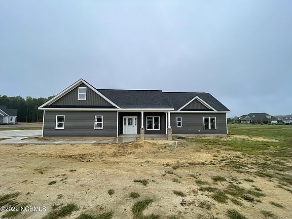 Nice new construction in Meares Bluff! Slab built home with handicap accessibility in mind, a perfect fit for those who desire wide entry ways, no step overs, all flush entry ways. At 1,844 square feet this property features 3 bedrooms with walk in closets, 2 full bathrooms, LVP flooring throughout. Kitchen with nice granite counters, SS appliances, central island, 2 barn door storage areas (pantry and coat closet). High vaulted ceilings in main living area with gas log fireplace. Screened in porch with TV hookup. Tankless hot water heater. Attached 2 car garage and another separate single car garage for storage.