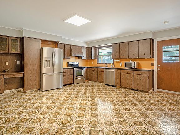 Welcome to this spacious 3-bedroom, 2-bath ranch that combines comfort, charm, and endless potential. Step inside to the spacious living room offering wood floors, a front-to-back fireplace, fresh paint, and a large picture window that fills the home with natural light. The eat-in kitchen/dining combo is generously sized and ready for your personal updating. Enjoy the outdoors on an oversized (30x16) deck-the perfect spot for gatherings, summer barbecues, or simply relaxing. The primary bedroom features its own private full bath, the updated main bathroom serves the additional two bedrooms. The full lower-level with walk-out offers a world of possibilities-partially finished to create a game room, home office, gym, or even a private in-law suite to suit your needs. Outside, the home is designed with a maintenance-free brick exterior, a brand-new roof, a 2-car attached garage, a storage shed, and a fenced dog pen. With city utilities and newer central air, comfort and convenience are built right in. Located just a short walk to the town center and with easy access to Route 8, this home puts you close to shops, dining, and commuter routes. Come take a look. Immediate occupancy.