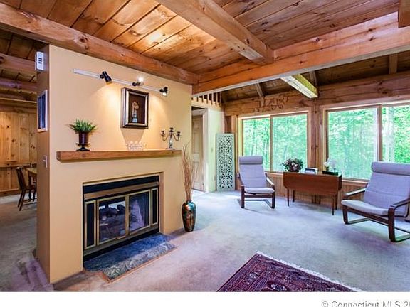 Amazing New Price is a great VALUE in the Guilford area. This totally unique timber frame contemporary home has a very flexible floor plan. It's like living in Vermont year-round on a 2.75 acre secluded lot. This three story architecturally designed home has 4 bedrooms, 3.1 baths, 4 fireplaces (two-sided), central air, propane heat, and newer roof. There is a new in-law/guest apartment on the lower floor with it's own entrance, brand new carpeting, tile bath and carpeting. Enjoy the serene ambiance of this property. Definitely not a drive-by. Great for year-round or week-end living.