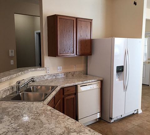 Looking for peace and quiet? This is your place! Situated on a corner lot in a cul-de-sac, this home features no rear neighbors, and an easy to maintain lifestyle. No yard maintenance, and no carpet in the house make it an ideal home for someone desiring a lock-and-leave. This home features high ceilings, an open floorplan, and a formal dining room that could be an office. Home comes with appliances. Sun City features golf, fitness centers, classes, swimming, trails, parks, etc. One occupant must be 55+.
