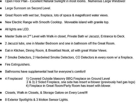 - Large Master Bedroom, Ceiling Fan(s), Washer Hook-up, Dryer Hook-up, Fireplace, Elevator, Half Bath, Newly Decorated, Laminated Counter Tops, Wet Bar, Handicap Access