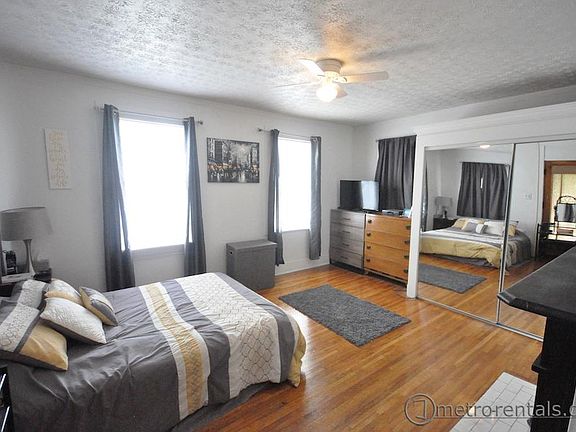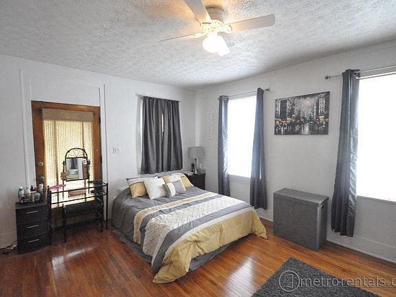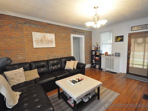 Spacious first floor duplex has living room with wood floors and exposed brick, doors opening onto large porch. Two bedrooms with great closets; modern kitchen has central island with bar stool area and track lighting. Washer/dryer included. Central air. Sorry, no pets.