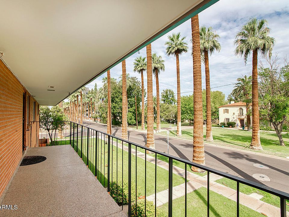 UNICORN ALERT! Welcome to Palm Lane Gardens, a beautiful mid-century co-op collection of homes just steps from the Phoenix Art Museum, Phoenix Theater, Arizona Opera, Burton Barr Library not to mention fabulous restaurants, coffee shops, stunning historic estate homes and the light rail. True urban living at your fingertips! This 2nd floor condo overlooks lush Palm lane with a wrap around balcony in front and a private balcony off the primary bedroom. Large floor to ceiling windows frame out the living room and dining creating a fantastic layout. 2 great size bedrooms with lots of storage plus an in-unit laundry! Vintage kitchen with lots of light too! This community has a beautiful pool and mature landscaping. Plus, this unit has a one car garage too! Cash only as this is a co-op.