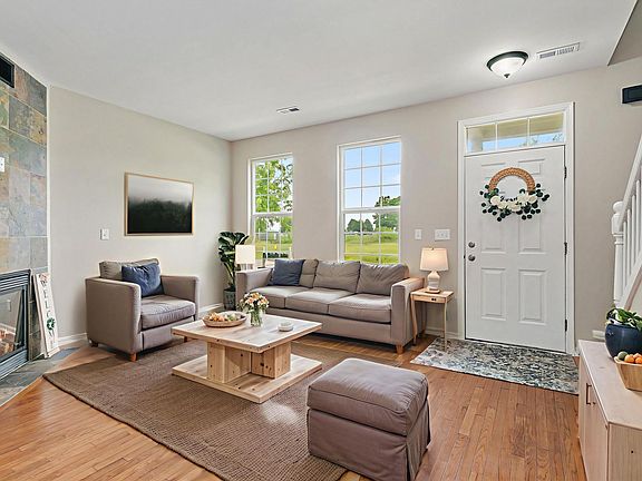 Welcome Home! Spacious & Stylish Townhome with Ideal Location and Modern Comforts - Step inside this warm and inviting townhome where comfort meets convenience! Freshly painted throughout and featuring brand-new carpet upstairs, this home is move-in ready with tasteful updates that enhance its appeal. You'll be welcomed by the cozy ambiance of the gas fireplace, beautiful hardwood floors on the main level, and soaring 9' ceilings that create an open, airy feel. The kitchen is complete with brand-new appliances, and a pantry for extra storage. Just off the kitchen, the spacious 2-car garage offers easy access for unloading groceries and daily convenience. Upstairs, retreat to the magnificent master bedroom, highlighted by cathedral ceilings and a generous walk-in closet. The updated full bath-accessible directly through the master closet-features dual-door entry for easy access. The second floor also includes all-new light fixtures and a convenient laundry area, plus an extra-wide hallway leading to two additional, well-sized bedrooms. The unfinished basement is ideal for a future home office, gym, playroom, or storage space. It's ready for your personal finishing touch! With a very reasonable HOA fee of just $90/month, this home is located in a prime area with easy access to the Eastern suburbs and the Elburn train station. This beautifully updated townhome offers incredible value, space, and location. Don't miss out-schedule your private tour today!