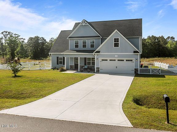 This beautiful home sits on a spacious 2.5-acre lot, offering a perfect combination of modern amenities and expansive outdoor space. The charming exterior features a welcoming front porch and a pristine two-car garage. Inside, the bright and open layout includes a large living area with soaring ceilings, perfect for relaxing or entertaining.