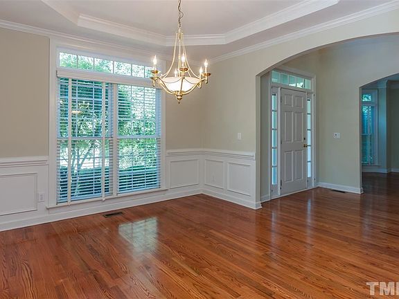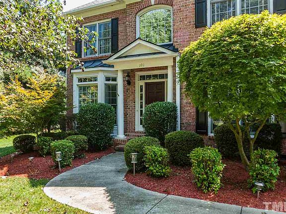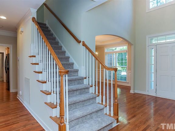 Stunning brick Front home in Preston Village on private 1/2 acre lot! Gourmet kitchen with granite & dual oven opens up to elegant 2 story family rm w/ fp & built-ins. 1st floor guest suite/office. Master suite w/ trey ceiling, separate tub & shower, skylight, WIC & sitting rm. Newly refinished hardwoods. Fresh interior paint throughout. 3rd floor w. full bath. Sun rm. Top Schools. Amazing community amenities. Minutes from RTP,RDU,I540! See agent only remarks.