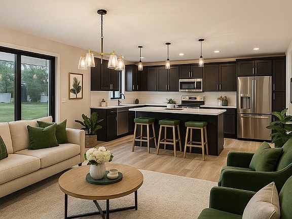 Sleek modern styling and a generous open floorplan awaits this showstopping new Cortland construction! Located within a highly desirable local neighborhood, this home puts you just seconds away from multiple downtown attractions, taking full advantage of its prominent location to bring a sizeable yard and cement rear patio. Dark colored siding is paired with black trim and accent work for a deep, moody look. A recessed entryway opens to reveal a hall-like foyer as a second hallway branches away towards the bedrooms. Stepping into the central great room, sunshine pours through the array of windows to warm the hardwood-styled flooring below. Stepped ceiling marks the living room portion where gas fireplace is met with a stunning mantle. Bespoke lighting choices continue through central dining to find a remarkable kitchen with its wide, polished stone countertops and bright stainless appliances that contrast the darker cabinetry. First floor laundry is located near garage access. Down the main hall, a pair of brightly lit guest bedrooms continue with ample closet space. They are joined by a handsomely appointed full bath, set before the master suite. Here, a large walk-in closet joins a second, full private bath with a floor entry shower. The oversized bedroom completes the floor. Downstairs, formed concrete walls surround plenty of storage space.